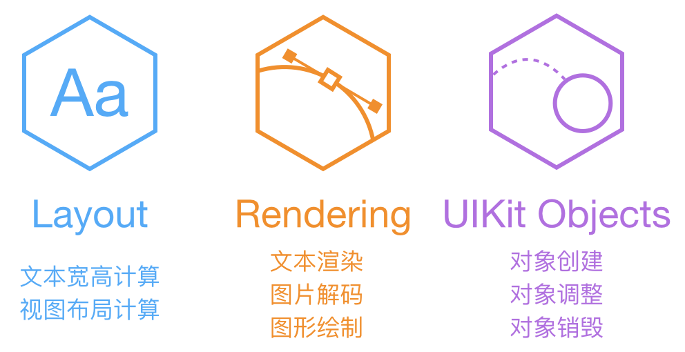 ASDK 认为阻塞主线程的任务主要分为上面三大类。文本和布局的计算、渲染、解码、绘制都可以通过各种方式异步执行,但 UIKit 和 Core Animation 相关操作必须在主线程执行。ASDK 的目标就是尽量把这些任务从主线程挪走,挪不动的就尽量优化性能。