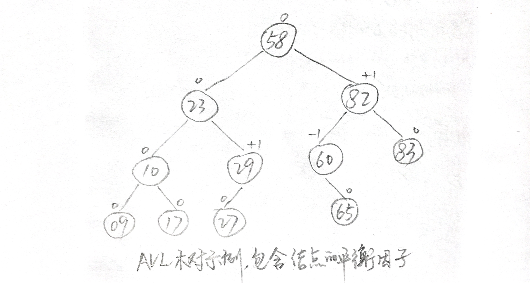 AVL树(Adel’son-Vel’skii and Landis)是一种特殊类型的二叉树,它的每个结点都保存一份额外的信息:结点的平衡因子。结点的平衡因子是它的左子树高度减去它的右子树高度的结果(见下图)。当插入结点时,AVL树需要自我调整,使得所有结点的平衡因子保持为+1、-1或0。当子树的根结点平衡因子为+1时,它是左倾斜的(left-heavy)。当子树的根结点平衡因子为-1时,它是右倾斜的(right-heavy)。一棵子树的根结点的平衡因子就代表该子树的平衡性。保持所有子树几乎都处于平衡状态,AVL树在总体上就能够基本保持平衡。