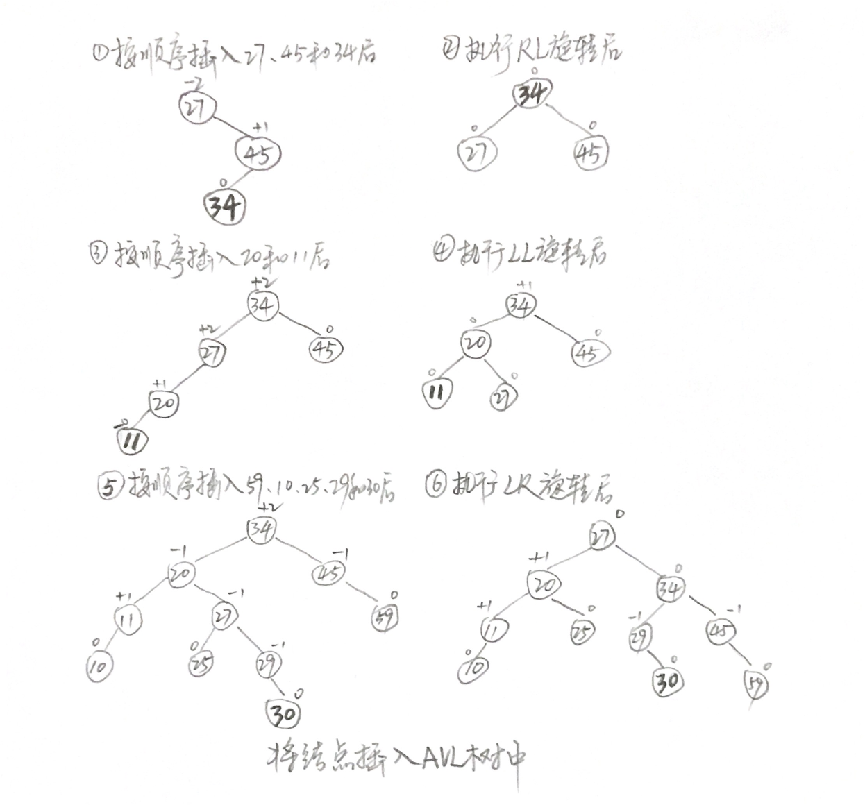 switch语句决定如何更新平衡因子,也决定何时应该执行旋转操作。实际用来执行旋转操作的函数要么是rotate_left要么是rotate_right,它们决定旋转的类型:如果调用rotate_left则是LL或者LR;如果调用rotate_right则是RR或RL。由于旋转操作会改变结点的平衡因子,因此每个旋转函数也会修正平衡因子。理解更新平衡因子和执行旋转操作的最好方式就是追踪下图中给出的例子。