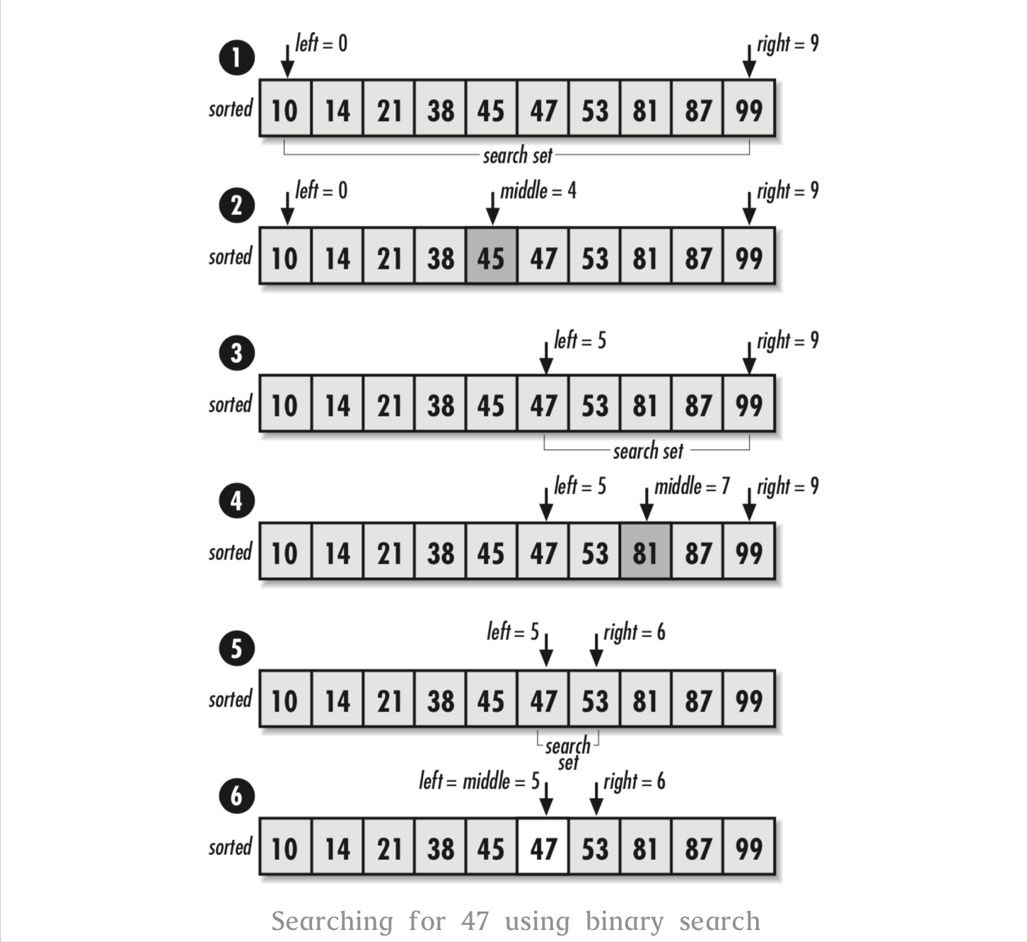 此实现过程的实施是通过变量left和right控制的一个循环来查找元素(其中left和right是正在进行查找的数据集的两个边界值)。首先,将left和right分别设置为0和size-1。在循环的每次迭代过程中,将middle设置为left和right之间区域的中间值。如果处于middle的元素比目标值小,将左索引值移动到middle后一个元素的位置上。即下一组要搜索的区域是当前数据集的上半区。如果处于middle的元素比目标值大,将右索引值移动到middle前一个元素的位置上。即下一组要搜索的区域是当前数据集的下半区。随着搜索的不断进行,left从左向右移,right从右向左移。一旦在middle处找到目标,查找将停止;如果目标没有找到,left和right将重合。下图显示了此过程。