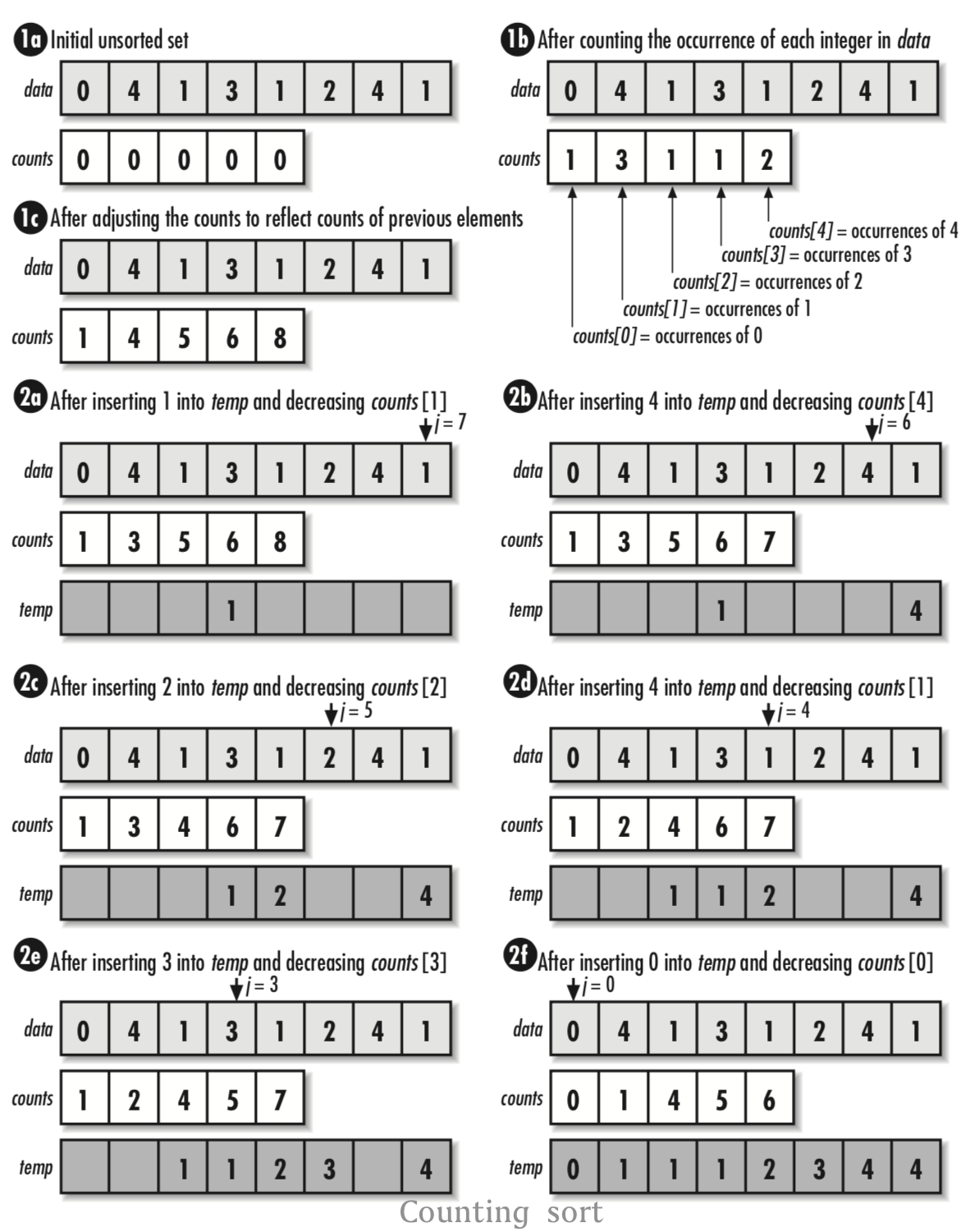 temp[counts[index] - 1] = data[j];