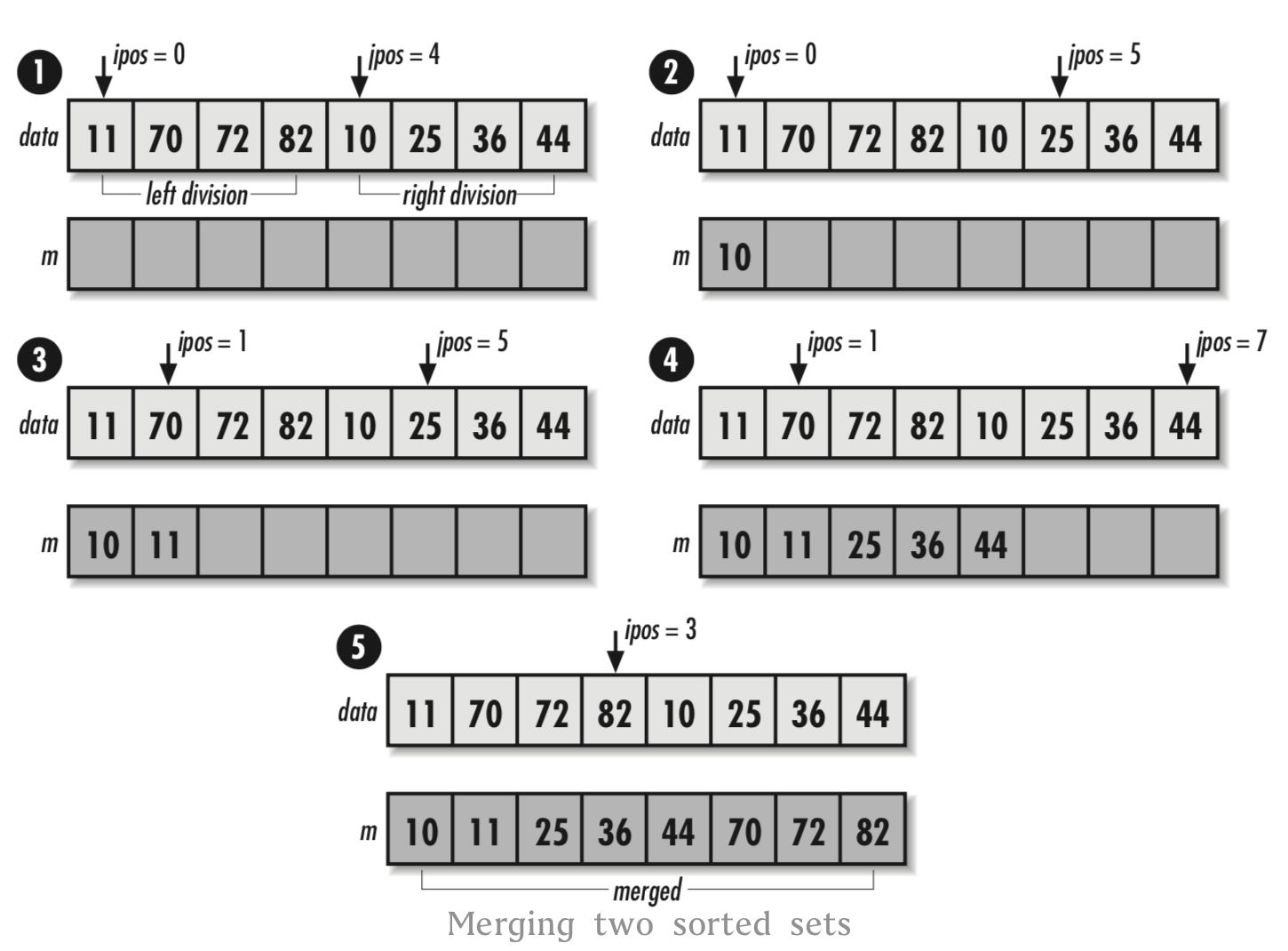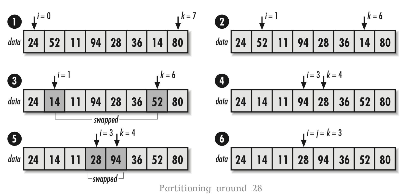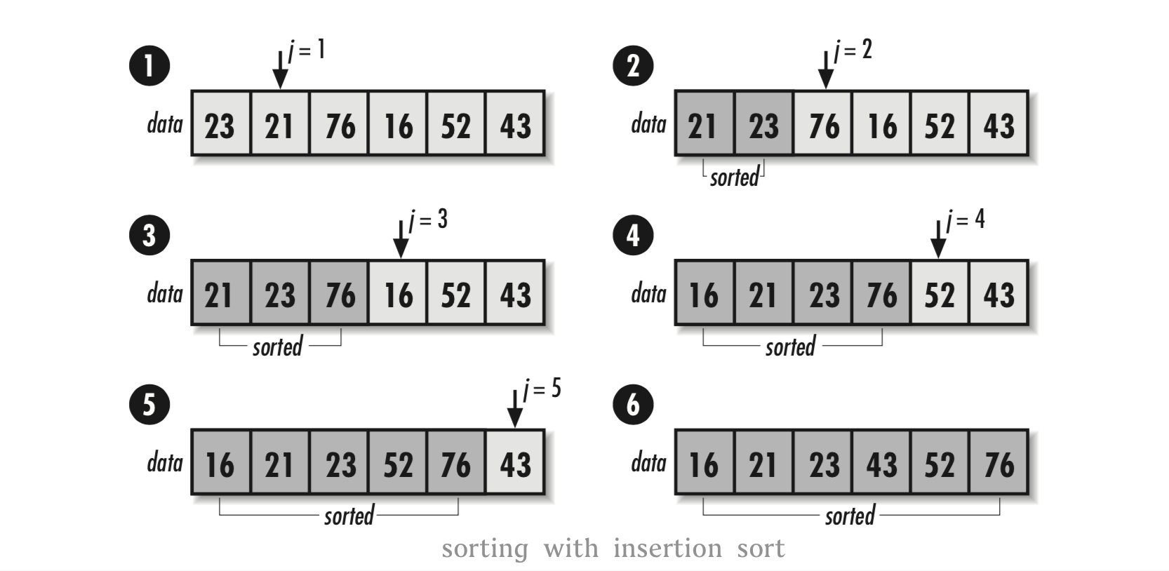 插入排序使用一个嵌套循环来解决问题。外部循环用标号j来控制元素,使元素从无序数据集中插入有序数据集中。由于待插入的元素总是会被插入有序数据集的右边,因此也可以认为j是data中分隔有序元素集和无序元素集的界线。对于每个处于位置j的元素,都会使用变量i来向后查找元素将要放置的位置。当向后查找数据时,每个处于位置i的元素都要向右移动一位,以保证预留出足够的空间来插入新元素。一旦j到达无序数据集的尾部,data就是一个有序数据集了。