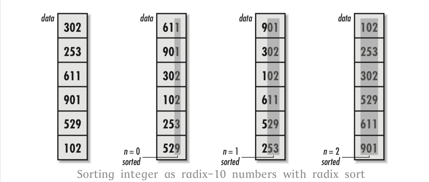 如果我们理解计数排序的方法,那么基数排序也就非常简单了。单个循环控制正在进行排序的位置(见下图)。从最低位开始,一个位置一个位置地应用计数排序来不断调整元素。一旦调整完了最高有效位的数值,排序过程完成。获取每位数值的简单方法就是使用幂运算和模运算。这对于整数来说特别有效,但不同的数据类型需要使用不同的方法。有一些方法可能需要考虑机器具体细节,例如字节顺序和字对齐。